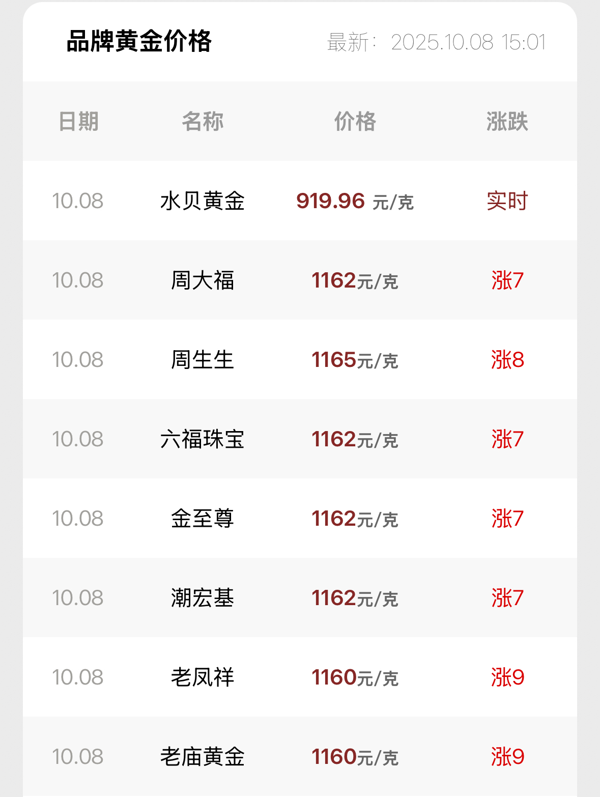 10月8日,记者从部分品牌金饰门店了解到,目前千足金饰品的价格普遍已经涨至每克1160元,周大福、六福珠宝、周大生饰品报1162元/克,周生生足金饰品最高报1165元/克,以此计算,国庆假期8天国内金饰克重涨了近40元。