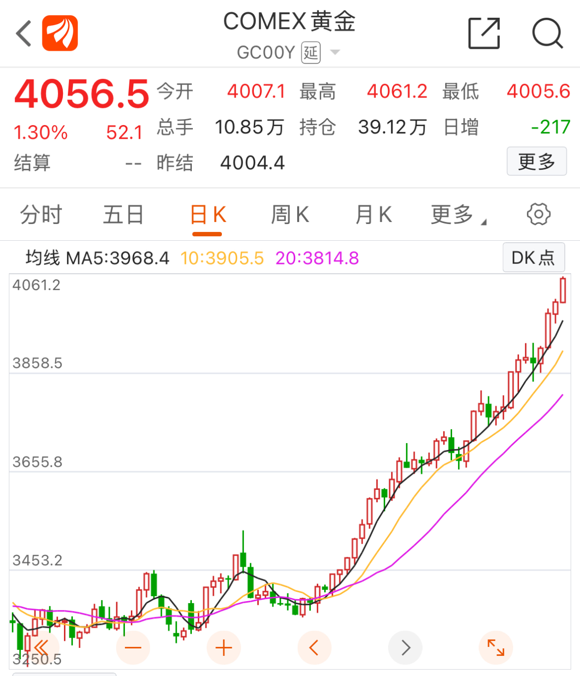 特别是9月底,金价开始狂飙。据央视财经报道,10月7日国际金价延续涨势,在当天亚洲交易时段一度触及每盎司4000美元整数关口,报每盎司4000.1美元,为历史上首次。10月8日,COMEX黄金期货价格最高触及4061.2美元/盎司,截至发稿,COMEX黄金期货报4056.5美元/盎司,年内涨超50%。